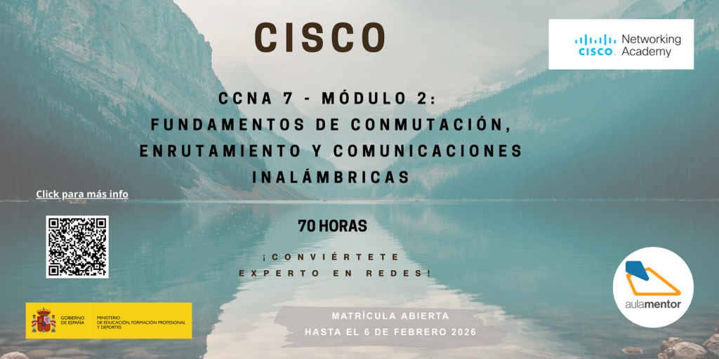 Hasta el 6 de febrero 2026 te puedes matriculas en Aula Mentor en el segundo módulo del itinerario formativo CCNA 7 de Cisco, dirigido a quienes hayan completado con éxito el Módulo 1. Este curso, de 70 horas de duración, se enmarca en la familia profesional de Informática y Comunicaciones y está orientado a profundizar en las tecnologías de conmutación, enrutamiento y redes inalámbricas (WLAN), incluyendo aspectos clave de seguridad.